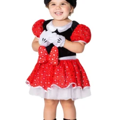 This sweet ensemble is officially licensed from Disney, so there will be no mistaking her look on Halloween night! The dress is black crushed velvet with red eyelet fabric at the skirt and sleeves, as well as a white underlay. And just look at that big red bow. The faux fur foot covers have attached satin bows and the hand mitts look just Minnie’s signature paws. The headpiece holds the iconic Minnie Mouse ears and bow and secures with a hook and loop fastener. It’s pure Minnie Mouse perfection!