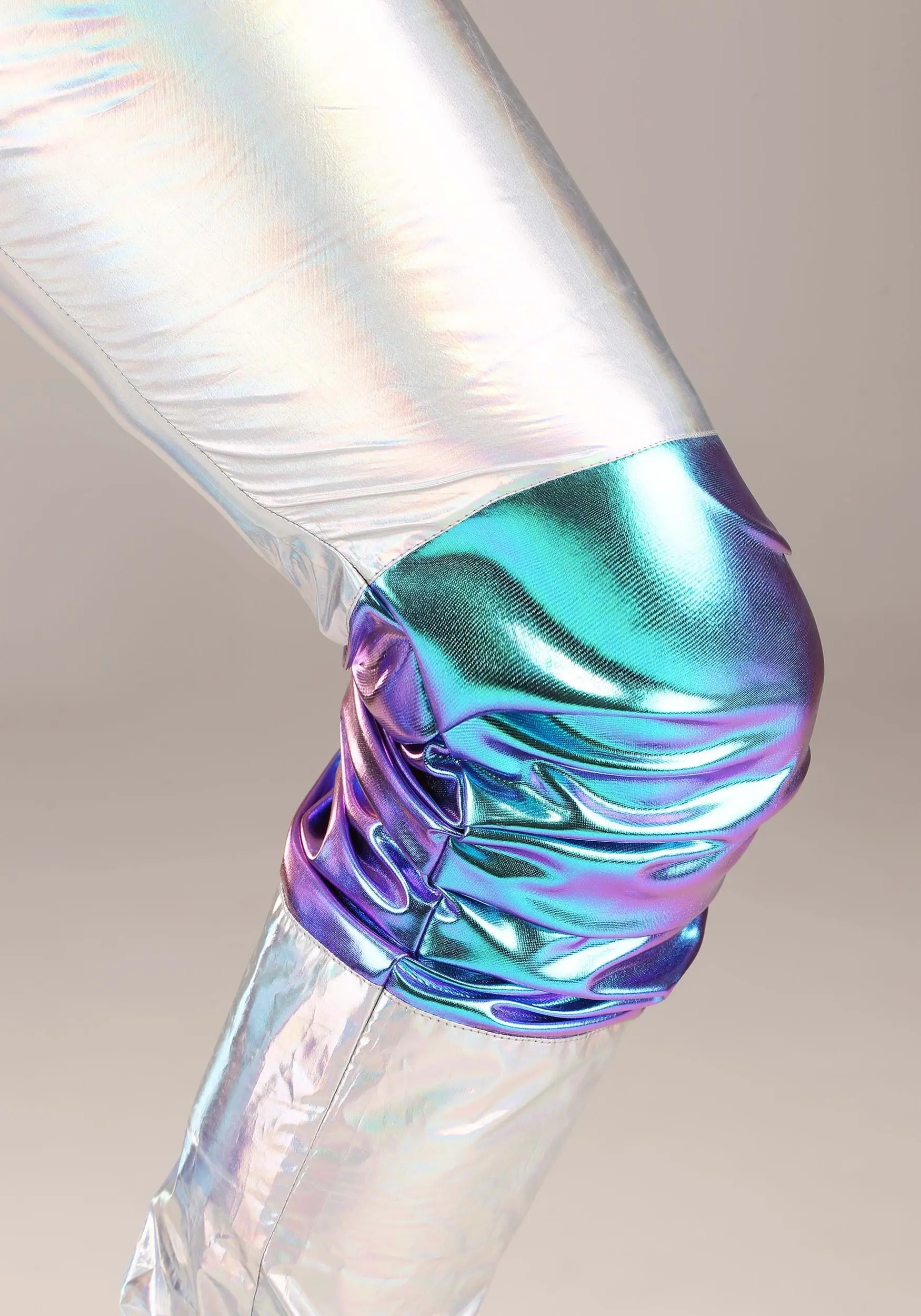 - Pants, jacket, & headband: 100% polyester; bodysuit & gloves: 93% nylon, 7% spandex