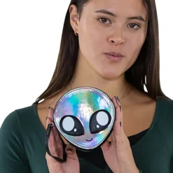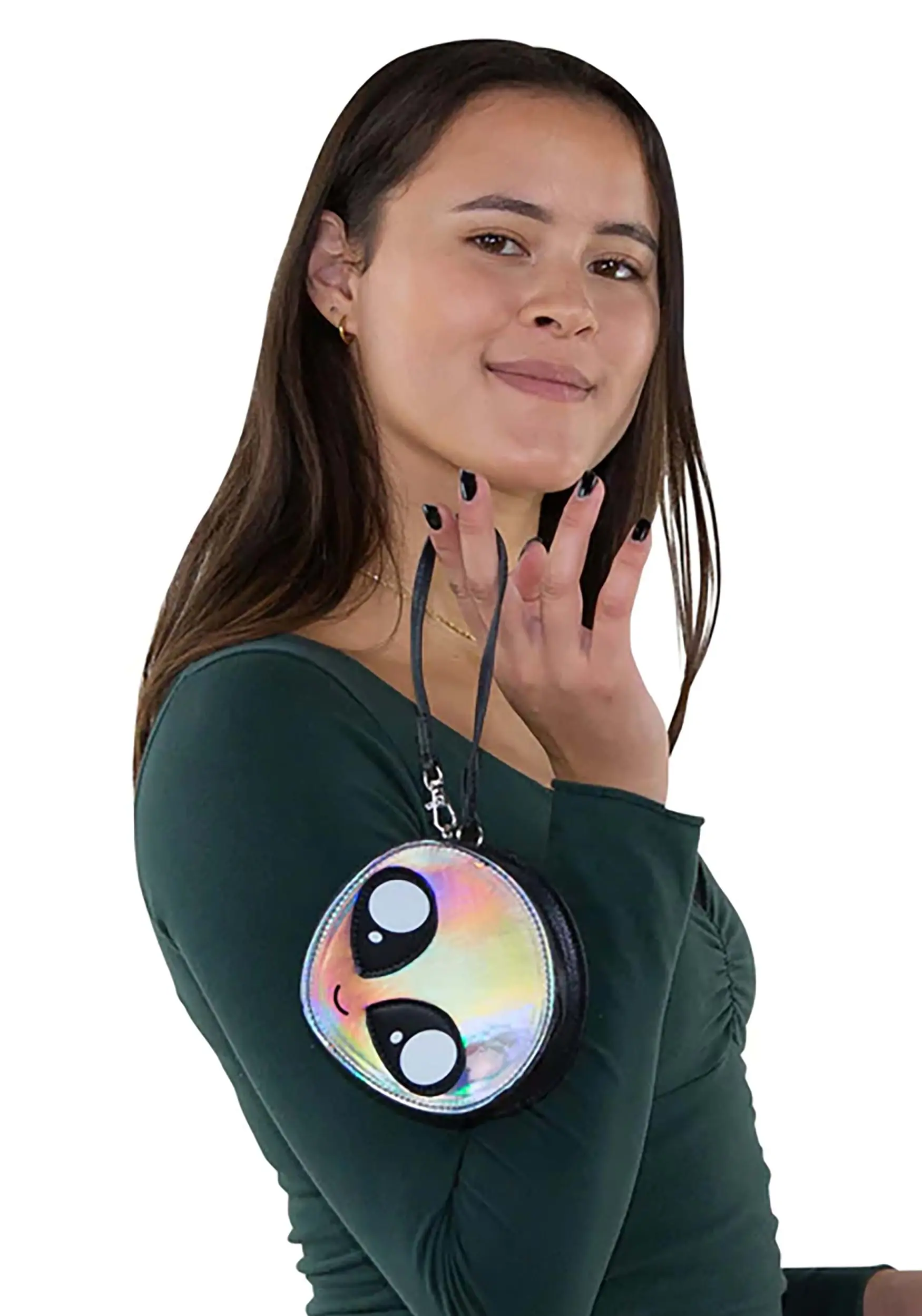 Bring your alien buddy along for the ride when you use your Silver Alien Women’s Wristlet! Its faux leather material features an iridescent finish and cute alien features. A top zipper closure keeps your belongings safe, and a strap with a lobster claw clasp can circle around your wrist. If you’re planning an outfit that’s out of this world, you need this mindblowing accessory!
