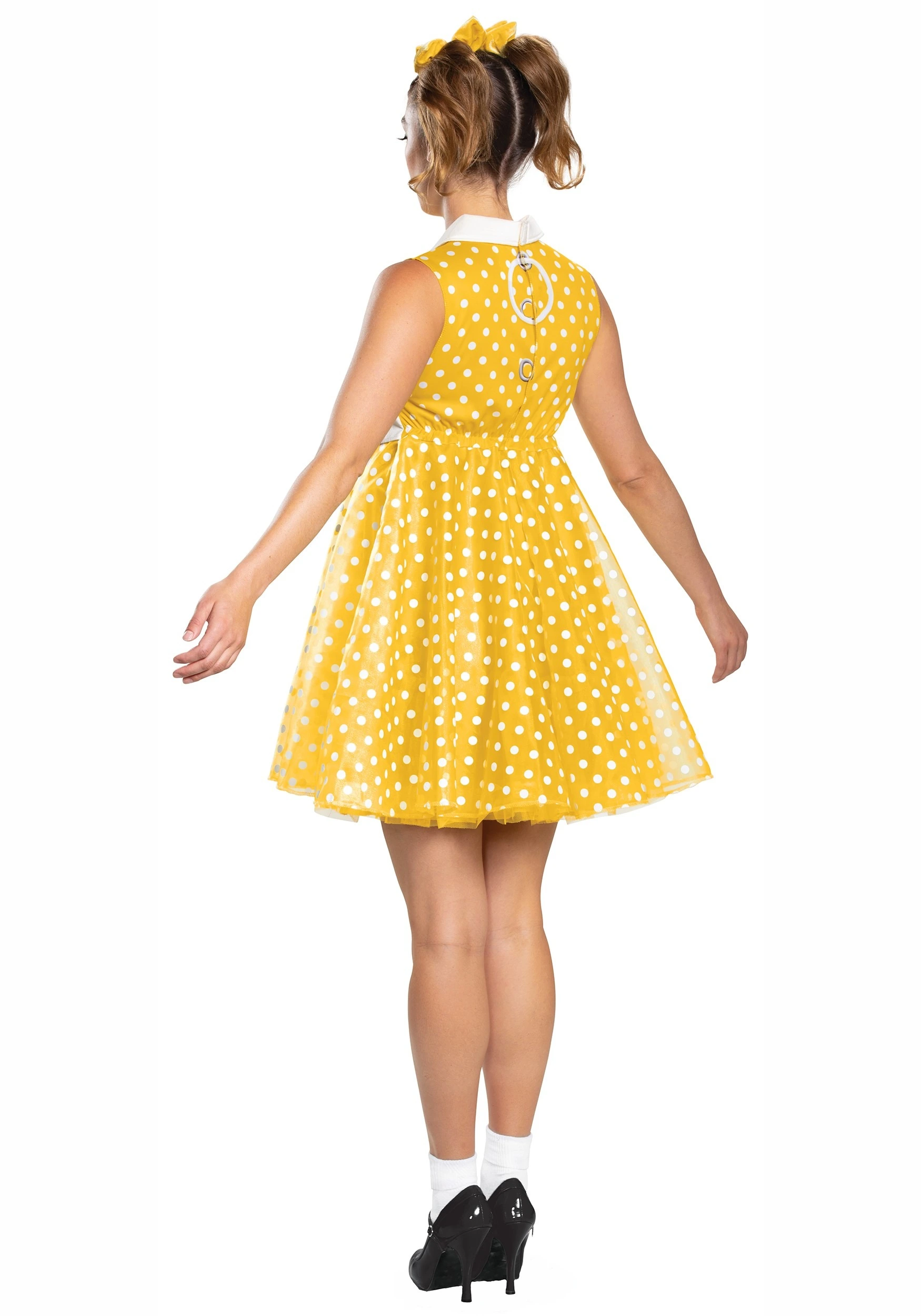 Ready to recite your tea time phrases? A great Gabby Gabby costume will make you ready to hop off the shelf and make new friends. Officially licensed, this Toy Story costume is from the final chapter. The dress has an adorable and flattering baby doll shape. The high cut neck has a curved white collar and high waistband. The skirt flares out, making twirling extra fun. The bright yellow polka dot fabric is adorable, retro, and rather photogenic. Pair this dress with pigtails, white ankle socks, and a character shoe to make yourself tea time ready.