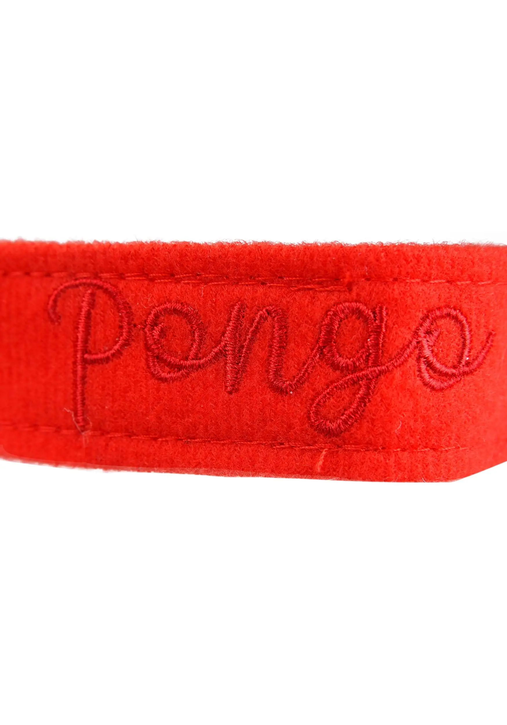 - Collar has Pongo’s name embroidered on it, and hanging foam dog tag