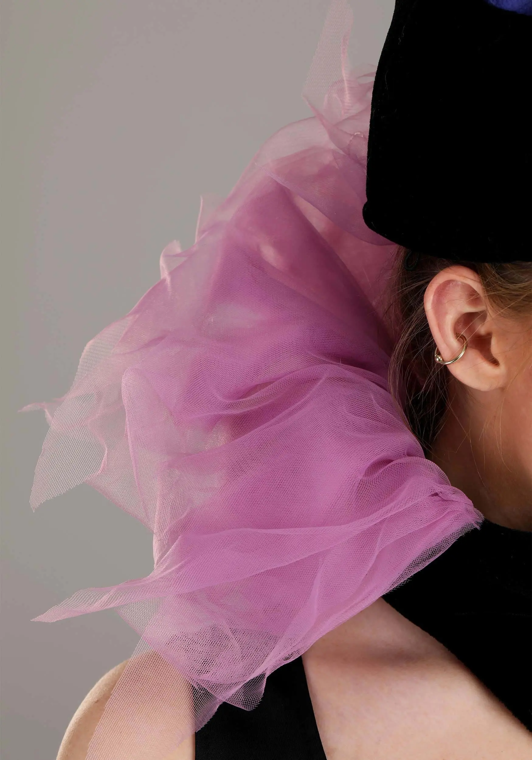 - Layers of ruffled, jagged-edged tulle sewn into top edge of collar