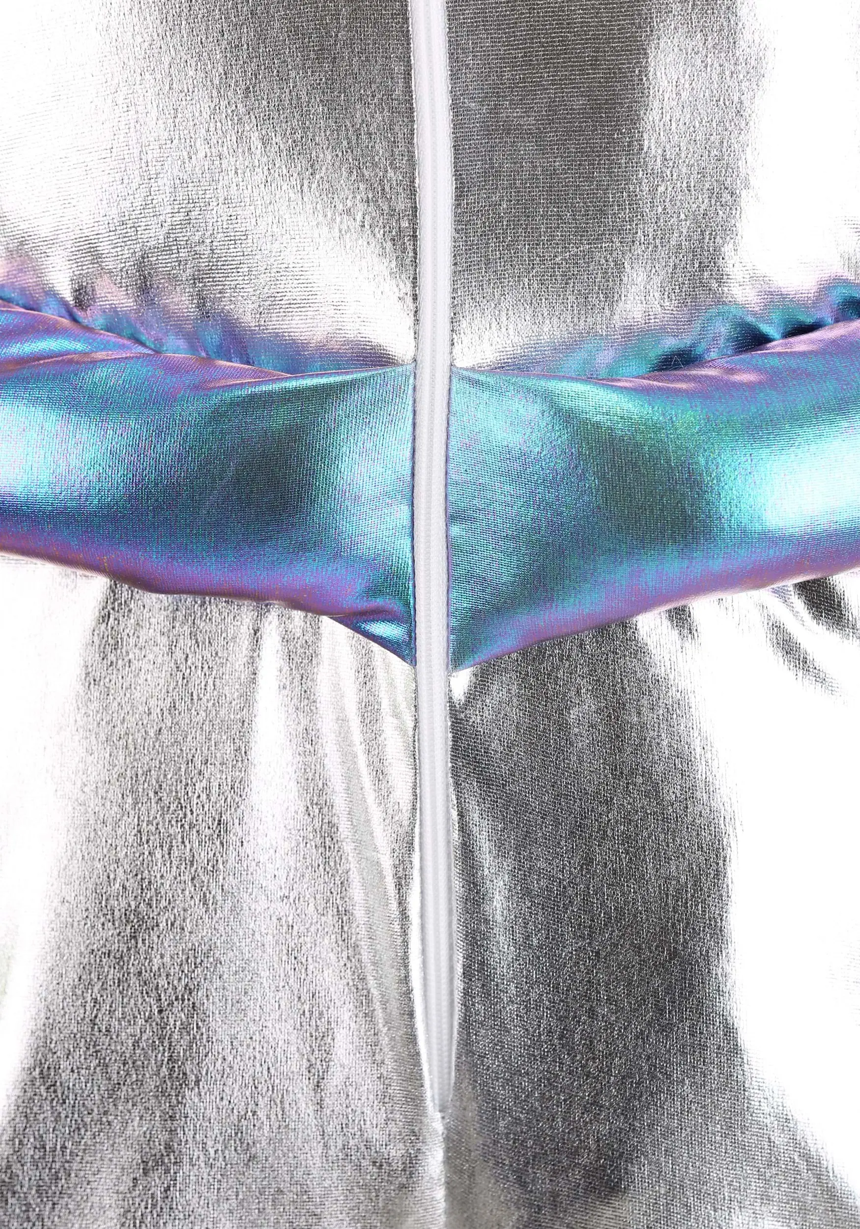 - Body of jumpsuit has metallic silver finish; side stripes & edging have iridescent finish