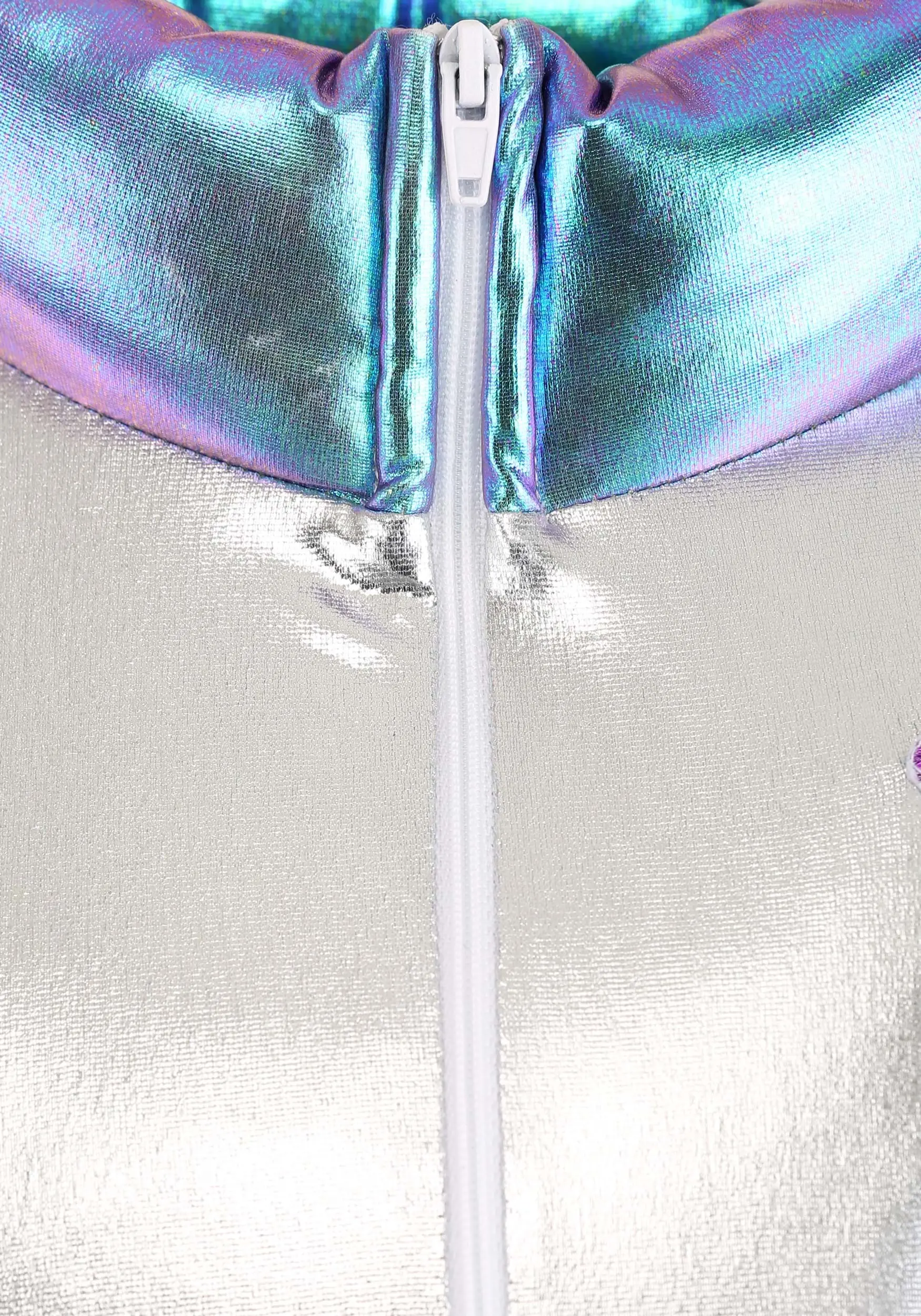 - Body of jumpsuit has metallic silver finish; side stripes & edging have iridescent finish