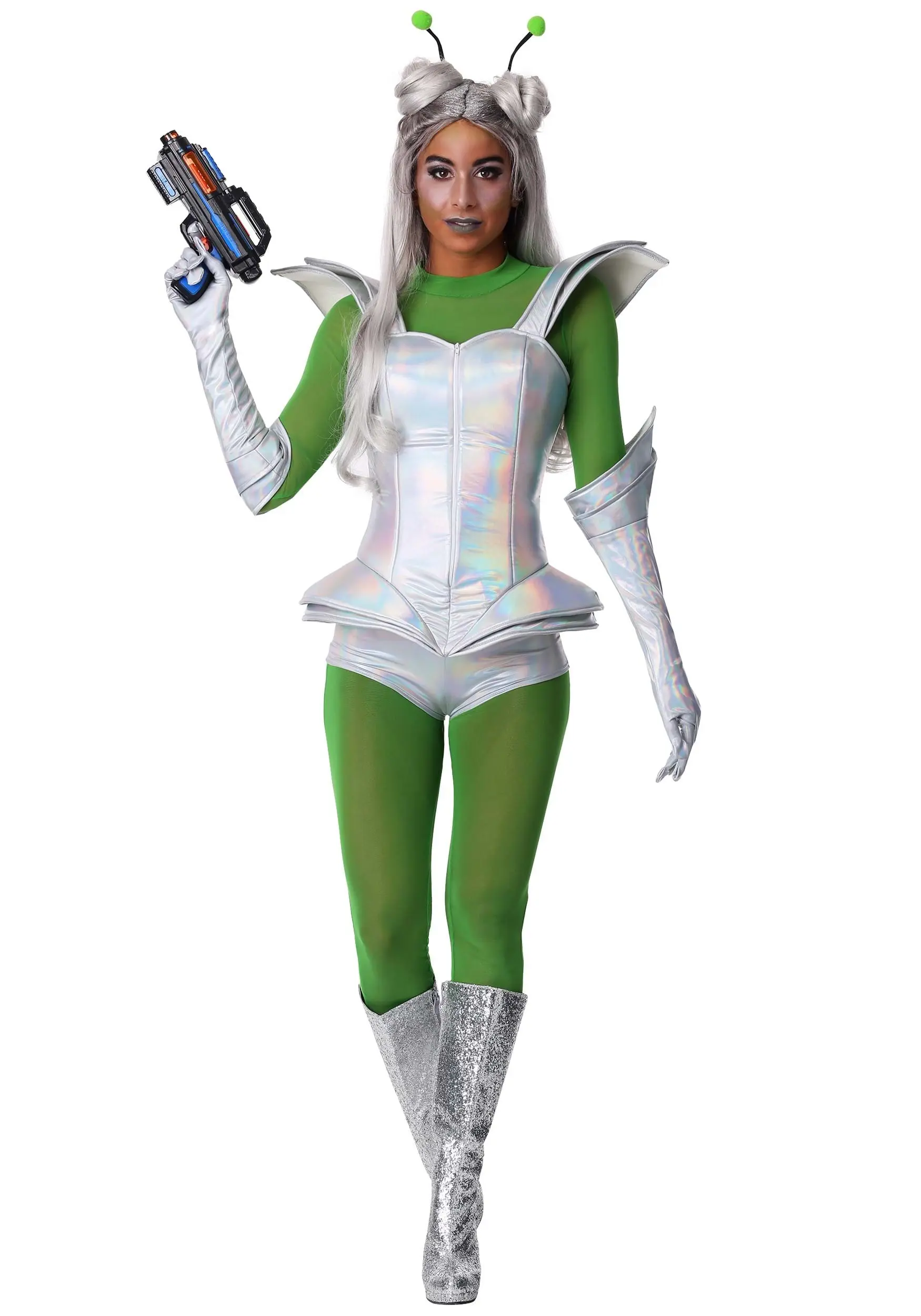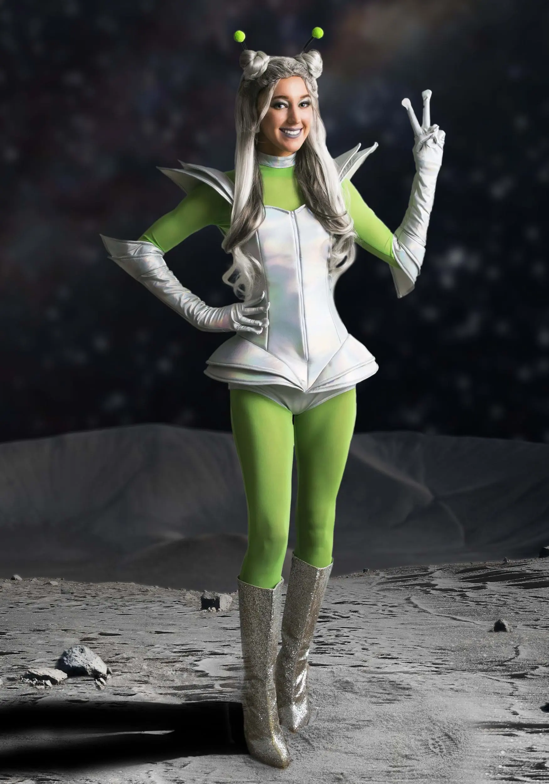 This costume is a Made by Us exclusive, designed right here in our own costume studios. It comes with a green top and leggings, to give you the appearance of being a green-skinned alien lady. A metallic shiny romper goes on top, secured in the front with a center zipper. Gloves and an antennae headband complete the style, and you can get the look as we have it pictured by adding silver boots, a silver wig, and green face paint. And a toy blaster if you’re so inclined! (Accessories sold separately.)