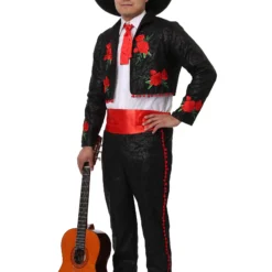 Now you can join the ranks of other beloved mariachi superstars with this Plus Size Men’s Mariachi Costume. The exclusive costume is made of 100 percent polyester and perfectly imitates a mariachi’s look. The black cropped jacket is covered in red rose appliques and trimmed in red fabric. There are matching appliques on the black pants and black hat as well. There’s also a red sash and a red tie for the front of your shirt.