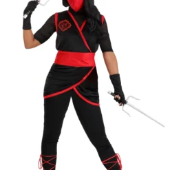 Showcase your awesome powers of sneakiness with an exclusive Stealth Ninja Costume! The outfit includes a black wrap tunic top with an attached hood that can be pulled up over your head, and crimson trim on its edges. The tunic goes over a short-sleeved mesh shirt. The wide red waist sash has a bow at the back. The red face mask conceals your true identity. The pair of snug and comfy black leggings has an elastic waistband. The sewn-in red cord leg wraps can be tied as desired. The black fingerless gloves will make it easier to grip your preferred prop weapon.