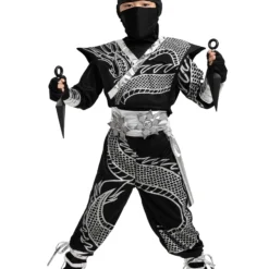 Help your tyke channel their mystical might when you give them this Child Dragon Ninja costume. This ensemble includes all that your kiddo will need to feel like they stepped right out of an epic video game or anime! The black jumpsuit features metallic printing that looks like a soaring dragon tail. Ribbons at the legs and an attached black hood create a silhouette that will have your kid feeling a real part of the fun. Kid-safe, foam weaponry can be worn on the silver belt or held in hand for an action-packed look. They include faux ninja stars and two foam kunai with open loops for your kiddo’s fingers. They’re just perfect with the fingerless gloves that finish off your little ninja’s transformation.
