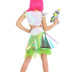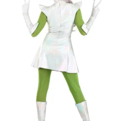 Does your little extraterrestrial come in peace? If so, reward him or her with a Silly Space Alien Costume for Toddlers! The exclusively designed one-piece jumpsuit is made of one hundred percent polyester with a minky texture that’s super soft to wear. (It’s unknown whether space aliens are scaly, furry, or feathered, but furry is clearly the most fun, so we prefer to imagine them that way.) Snap buttons along the inseam provide easy diaper or pull-up access, if needed. The suit’s attached foam mitts can be pulled down to free the hands thanks to slits on the back of each. The rounded hood is decorated with oversized black alien eyes and two upright antennae so that your little one can stay in contact with the mother ship.