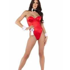 Hop into classic couture with this officially licensed Red Playboy Bunny costume. This spandex blend bodysuit zips up the back and features structural support to hold its shape along with a foam-backed bust. A matching satin bow tie combined with a pair of cuffs and bunny ears on a fabric-covered headband accessorizes your outfit. All that is left is the attached bunny tail and Playboy ribbon and you’re the life of the party!