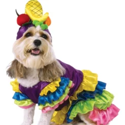Your pet will be the hit of any gathering in her Brazilian Bombshell Pet Costume! Her dress is fit for a flamenco dancer, with ruffled cap sleeves and multicolored ruffle tiers trimming the skirt. With these flounces, she won’t have to wait until bath day to shake it! A sweet little cap adorned with tropical fruit graces her head. She’ll look good enough to eat!